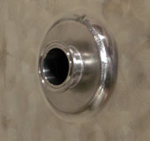 Swaged Port and Reinforcing Ring. Swaging means punching a hole, then pushing out the tank wall. This makes a stronger connection. All ports are swaged. Reinforcing Ring is actually on the inside of the tank but its outline can be seen in the photo. It is 3.5" diameter x 1/4" thick. This greatly strengthens the racking valve connection. The reinforcing ring was introduced to the American market by Letina nearly 20 years ago. |